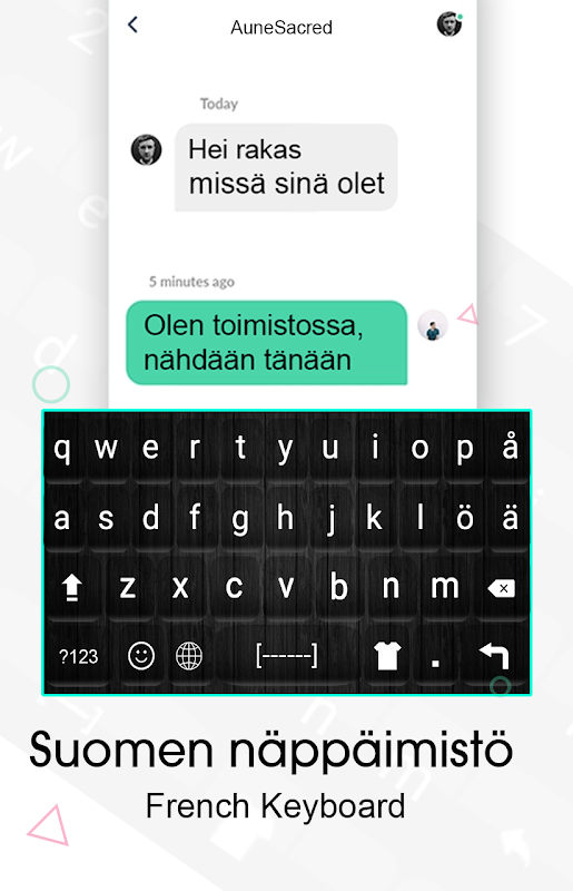 Finnish English Keyboard - Finnish Input Keypad memungkinkan Anda untuk memasukkan emoji sesuai dengan mode Anda. Finnish English Keyboard - Finnish Input Keypad memberi Anda fitur saran kata yang akan memberi Anda kata-kata yang disarankan saat Anda menulis pesan. Finnish English Keyboard - Finnish Input Keypad adalah aplikasi android dan Anda memerlukan ponsel atau tablet android untuk menggunakan aplikasi ini. Keyboard Bahasa Finlandia Bahasa Finlandia - Papan tombol Input Bahasa Finlandia akan muncul sebagai ganti keyboard ponsel default Anda setelah Anda mengatur keyboard ini sebagai keyboard default Anda. Anda dapat menulis karakter Finlandia dan Inggris dengan lancar.