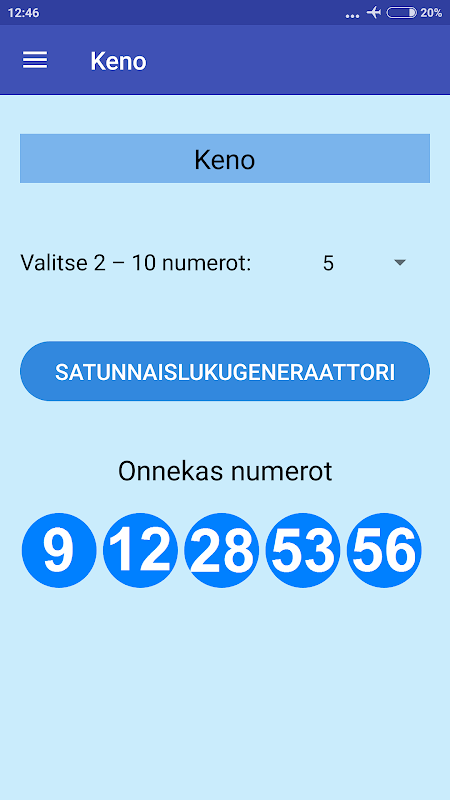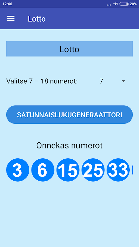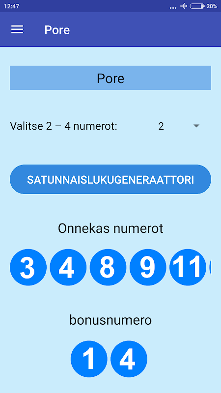 Dengan aplikasi gratis ini Anda dapat memilih nomor acak untuk permainan Finnish Lotto, Vikinglotto, Eurojackpot, Keno, Syke, Pore, kaikki tai ei mitään, Jokeri dan setiap permainan lotre.