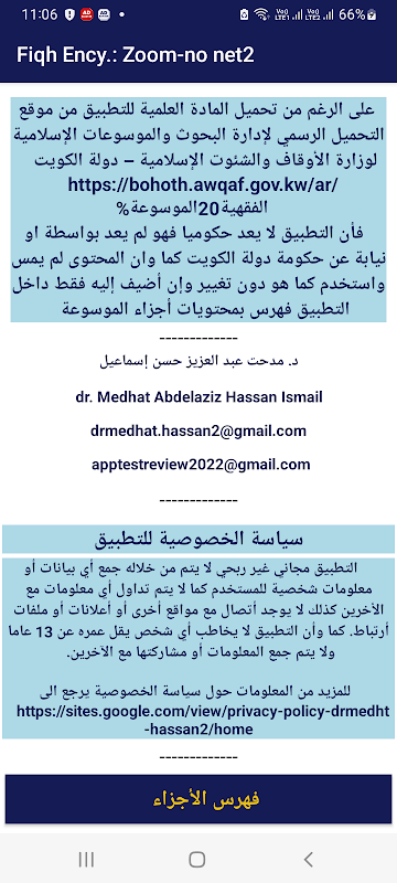 Aplikasi ini tidak dikembangkan oleh atau atas nama pemerintah Negara Kuwait. Bahan yang digunakan apa adanya, dan tidak berubah. Hanya indeks isi bagian ensiklopedia yang ditambahkan ke aplikasi. Aplikasi ini mencakup bagian 16 sampai 30 dari ensiklopedia Awqaf yang dikeluarkan oleh Kementerian Awqaf dan Urusan Islam - Negara Kuwait, dalam 45 bagian. Di sini dibagi menjadi 3 bagian (aplikasi) dengan fitur memperbesar font tanpa internet. Kebijakan privasi ditetapkan di: