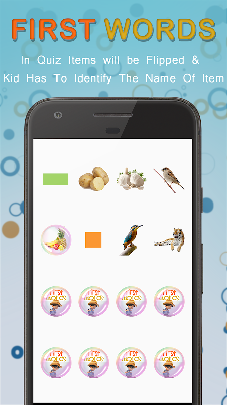 Random words will be hidden and by tapping on each image will flip the word and your baby should be able to recognize and speak each word after it flips.