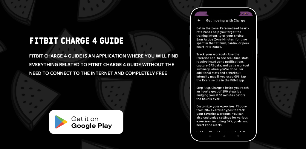 This mobile application is a guide that gives information about Fitbit charge 4. From this app, you can learn about device settings and usage, fitbit versa synchronization, band changing and wearing, fitbit charge 4 setup, how to charge the device, notification configuration, navigating, alarm setup and fitbit charge 4 watch face change.