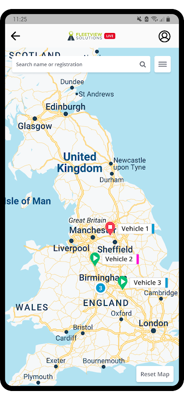 Aplikasi Fleetview menawarkan versi sistem lengkap yang disederhanakan, menunjukkan peta langsung semua kendaraan.