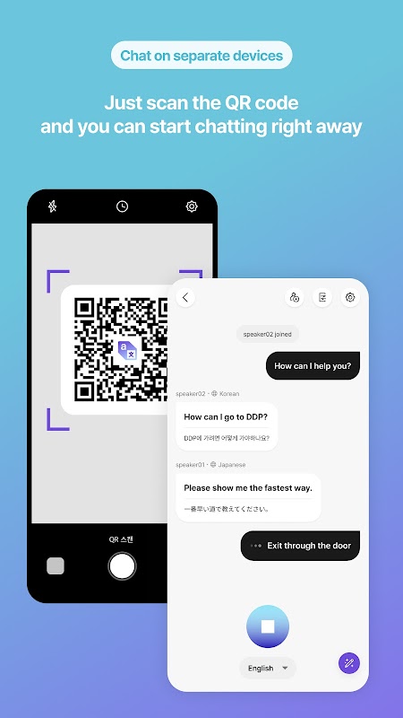 Bergabunglah dengan mudah ke dalam percakapan multibahasa dengan memindai kode QR atau mengeklik tautan bersama, tanpa perlu mengunduh aplikasi untuk tamu.