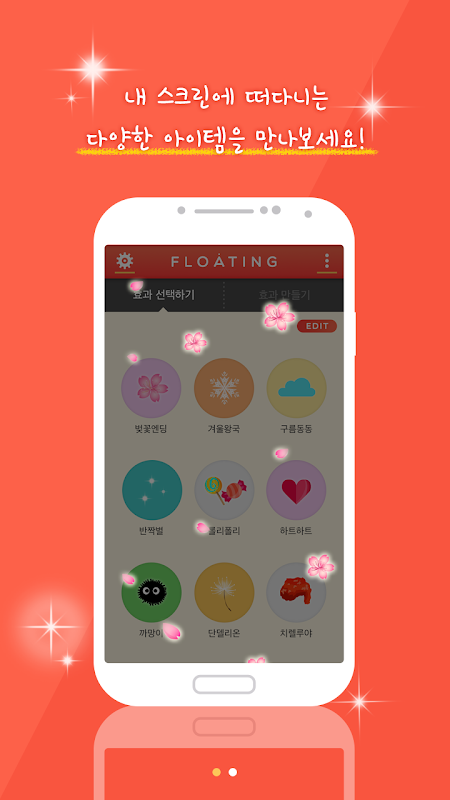 Floating은 핸드폰 화면 위에 벚꽃 내리기, 눈 내리기, 별 반짝이기, 겨울왕국, 치킨떠다니기, 구름 떠다니기 등의 효과를 줄 수 있는 어플입니다. 사진을 이용해 직접 효과를 만들 수도 있습니다.