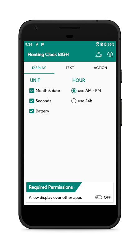 Useful for you when on full-screen apps like watching film, play game, ect... with Floating Clock.