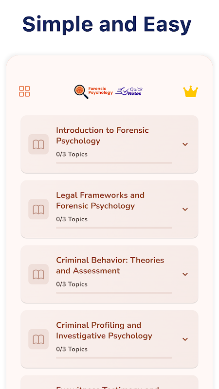 Kuasai Psikologi Forensik dengan mudah dengan aplikasi lengkap ini. Mulailah perjalanan Anda hari ini dan jelajahi pikiran di balik perilaku kriminal.