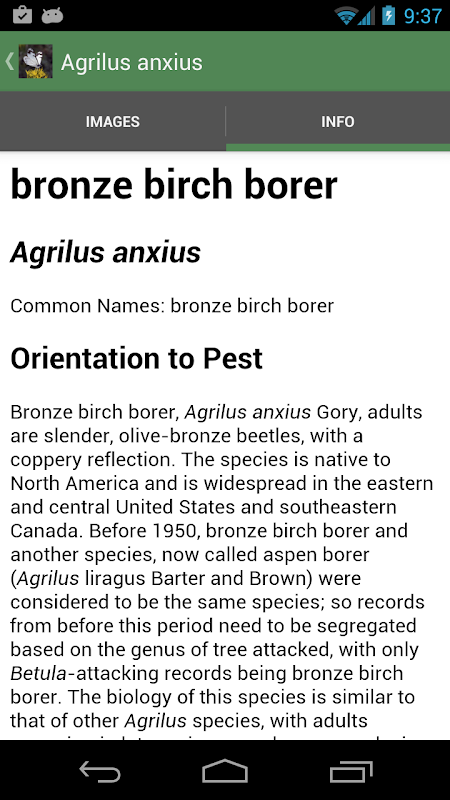 Foto-foto yang ada di App ini dimaksudkan untuk membantu rimbawan, karyawan lansekap perkotaan, atau orang lain yang bekerja dengan pohon-pohon mengenali beberapa serangga hama umum yang mempengaruhi pohon di Amerika Utara dan memahami siklus hidup mereka dan bagaimana mereka merusak pohon. Informasi diambil dari buku, website, lembar fakta, dan beberapa literatur asli. App ini bukan panduan untuk spesialis. Di banyak kelompok, seperti kumbang kulit kayu dan kutu daun, konfirmasi identitas spesies membutuhkan perhatian terhadap detail tidak terlihat di foto dengan perbandingan dengan spesies lain yang sejenis dan penggunaan kunci. Sumber untuk informasi lebih lanjut (website dan artikel) yang diberikan di bagian bawah halaman masing-masing spesies.