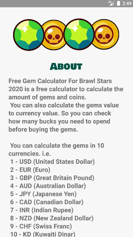 Aplikasi ini dalam kalkulator mata uang game untuk game Brawl Stars oleh Supercell. Ini tidak resmi dan tidak terkait dengan Supercell. Semua gambar, latar belakang, adalah milik Supercell. Untuk informasi lebih lanjut, lihat Kebijakan Konten Kipas Supercell http://supercell.com/en/fan-content-policy/