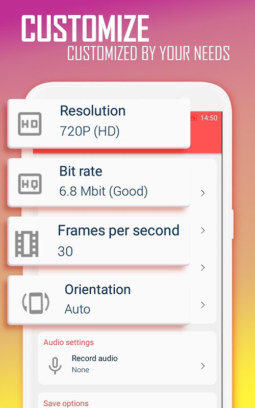 - Multiple resolution screen record: HD, FHD, QHD.