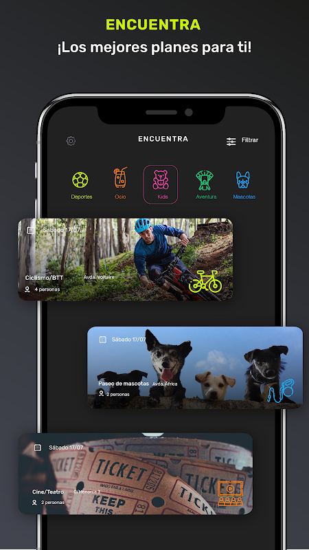Setelah Anda mendaftar, ketika Anda mengakses Aplikasi, Anda akan melihat peristiwa dari kategori yang telah Anda pilih, dan jenis kelamin dan usia yang Anda inginkan. Mereka yang muncul kepada Anda akan selalu menjadi yang paling dekat dengan tempat tinggal Anda, dan Anda dapat memilih jarak di mana Anda ingin mereka muncul.