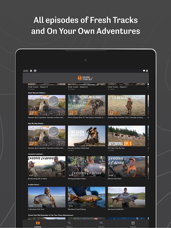 Fresh Tracks+ adalah rumah streaming Randy Newberg, Hunter; Trek Baru; dan Tentang Petualangan Anda Sendiri. Kami menampilkan konten berburu tanah publik dan menampilkan peluang berburu yang tersedia untuk semua orang di seluruh tanah publik Barat.