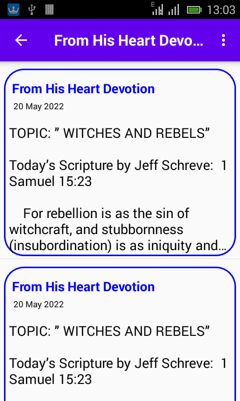 Aplikasi seluler Jeff Schreve Devotion adalah alat yang menyediakan cara mudah untuk membaca renungan harian Anda saat bepergian, ini menyediakan antarmuka yang mudah digunakan yang mengatur pembacaan ke dalam tanggal kalender sehingga