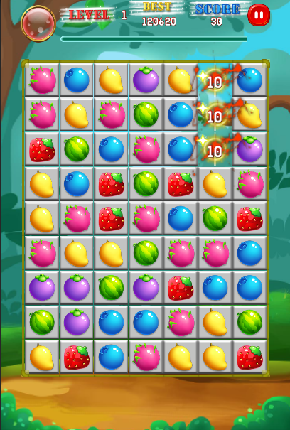Dapatkan poin dengan menghapus Buah. Anda dapat membuat rantai lagi dari buah untuk mendapatkan lebih banyak poin!