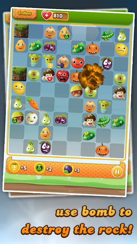 ✔ 4 boosters: Timer, Hint (Search), Refresh, Fruit Bomb (boom the rock or fruit)