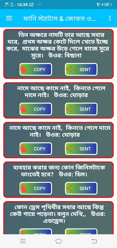 Bangla Status Lucu এই অ্যাপস এর ভিতরে রয়েছে মজার জোকস প্রেমের ধাঁধা, মজার এসএমএস যা আপনার প্রিয়জনকে আনন্দ দেবার জন্য এই অ্যাপসটি যথেষ্ট। মনের মানুষকে খুশি রাখতে মজার স্ট্যাটাস এপপ্সটি খুব প্রয়োজন। আপনি যদি প্রিয় মানুষগুলোর সাথে খুশি থাকতে চান থাহলে আমাদের এই এপপ্সটি এখনই ব্যবহার করুন। মেয়েদের বুদ্ধি পরীক্ষা করার জন্য ছোট ছোট ধাঁধা জিজ্ঞেস করতে পারেন এগুলো আপনি মেয়েদেরকে বললে মেয়েরা বেশি আনন্দ পাবো। সব ধরনের মজার জোকস, ধাঁধা এবং ফানি স্ট্যাটাস ও ক্যাপশন পেতে অ্যাপসটি ডাউনলোড করতে পারেন ধন্যবাদ।