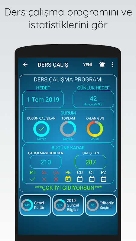 Bu bölümde 2019 KPSS ve diğer sınavlar için güncel sorular/bilgiler ile genel kültür sorularına/bilgilerine çalışacaksınız. Ama öncelikle ders çalışma programı yapmanız gerekmekte. Ders çalışmayı bitirmeyi hedeflediğiniz tarihi seçerek bir ders çalışma programı oluşturacaksınız. Burada, hedeflediğiniz tarihe kaç gün kaldığına göre günlük çalışma hedefi uygulama tarafından otomatik olarak belirlenmekte. Dolayısıyla her gün için bir günlük çalışma hedefiniz ve o güne kadar toplam çalışma hedefiniz olacak. Ders çalışma menüsünde, günlük çalışma hedefi, çalışılan soru/bilgi sayısı, hedefe kaç gün kaldığı, haftanın hangi günlerinde hedefinize ulaştığınızı grafiklerle görecek ve performansınızı takip edebileceksiniz. Ayrıca eğer isterseniz, size her gün hatırlatma yapmak için uygulamaya hatırlatıcı ekleyebilirsiniz. Son olarak, Güncel bilgi ve genel kültür bilgilerini içeren çalışma materyallerine de bu bölümden ulaşılmaktadır.