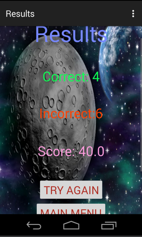 This app helps user to sharpening their knowledge and senses, help them to prepare for exams or tests which are based on astronomy and helps them to increase their knowledge and memory. This app targets people of all ages, even children could enjoy quizzes created by this trivia game and could enhance their Universe knowledge. This app contains cool features like coloring buttons green if the answer is correct otherwise colored it red because the answer is wrong. It contains good graphics and less ads. This app is extremely efficient, it is developed in such a way so that it could run smoothly in any android device.