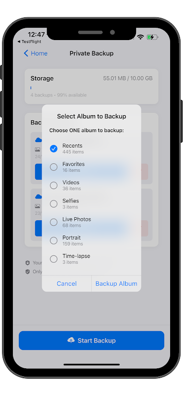 Jangan pernah khawatir kehilangan kenangan berharga. Cadangkan foto Anda ke penyimpanan cloud pribadi kami yang terenkripsi sebelum menghapusnya. Pulihkan kapan saja hanya dengan satu ketukan. Foto Anda dilindungi dengan enkripsi end-to-end AES-256.