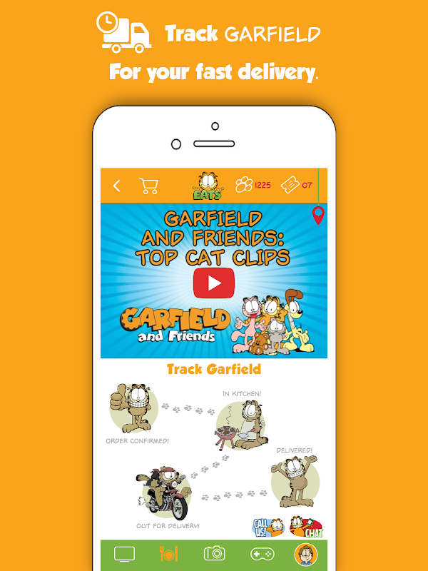 With GarfieldEATS, you can watch, play, order, read, collect, redeem, track, manage, chat, share, and much more with this All-in-One mobile app. We call it "Entergaging" — entertaining + engaging