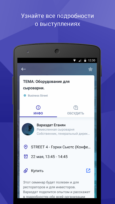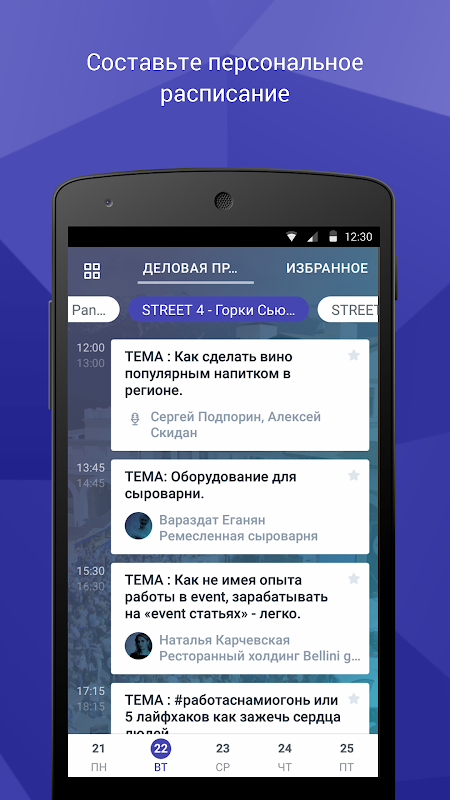 - составить собственную программу и получать оповещения о начале избранных докладов;