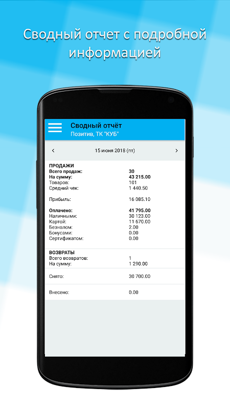Мобильное приложение для просмотра отчетов из торговых точек (магазинов, кафе), которые работают под управлением настольной версии GBS.Market.