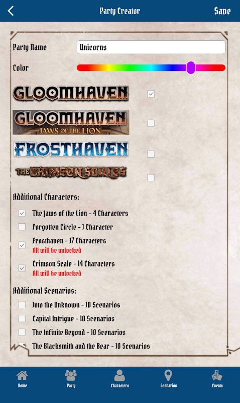 Dengan GCT, dimungkinkan untuk melacak kemajuan permainan di permainan papan. Ini sangat berguna ketika Anda ingin memainkan beberapa kampanye secara paralel atau hanya mengelola karakter Anda sendiri.