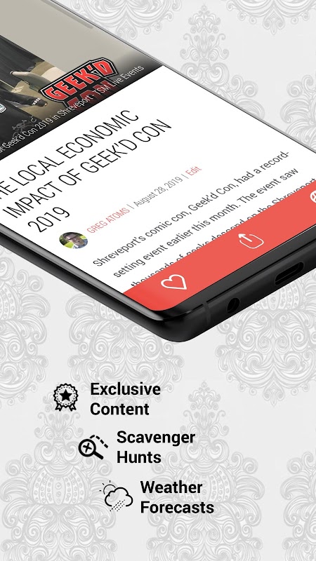 Sekarang Anda dapat memiliki kekuatan Geek'd Con di telapak tangan Anda dengan aplikasi seluler The Geek'd Con! Anda akan dapat menerima pengumuman tamu yang dikirim langsung ke perangkat Anda. Anda juga bisa mendapatkan pembaruan tentang tiket, menemukan info acara, dan semua berita geek yang Anda butuhkan. Vendor juga dapat menemukan info dan mendaftar melalui aplikasi.