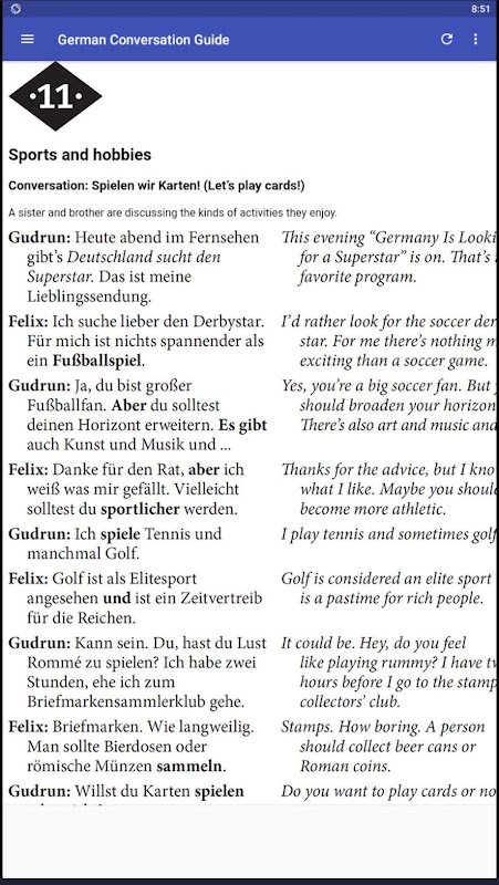 This app is designed to provide linguistic scenarios that reinforce conversational language. Grammar and vocabulary are of course used in all foreign-language books and therefore appear in this book as well. However, the main goal here is to develop conversational skills in German, not just to practice grammatical structures and vocabulary.