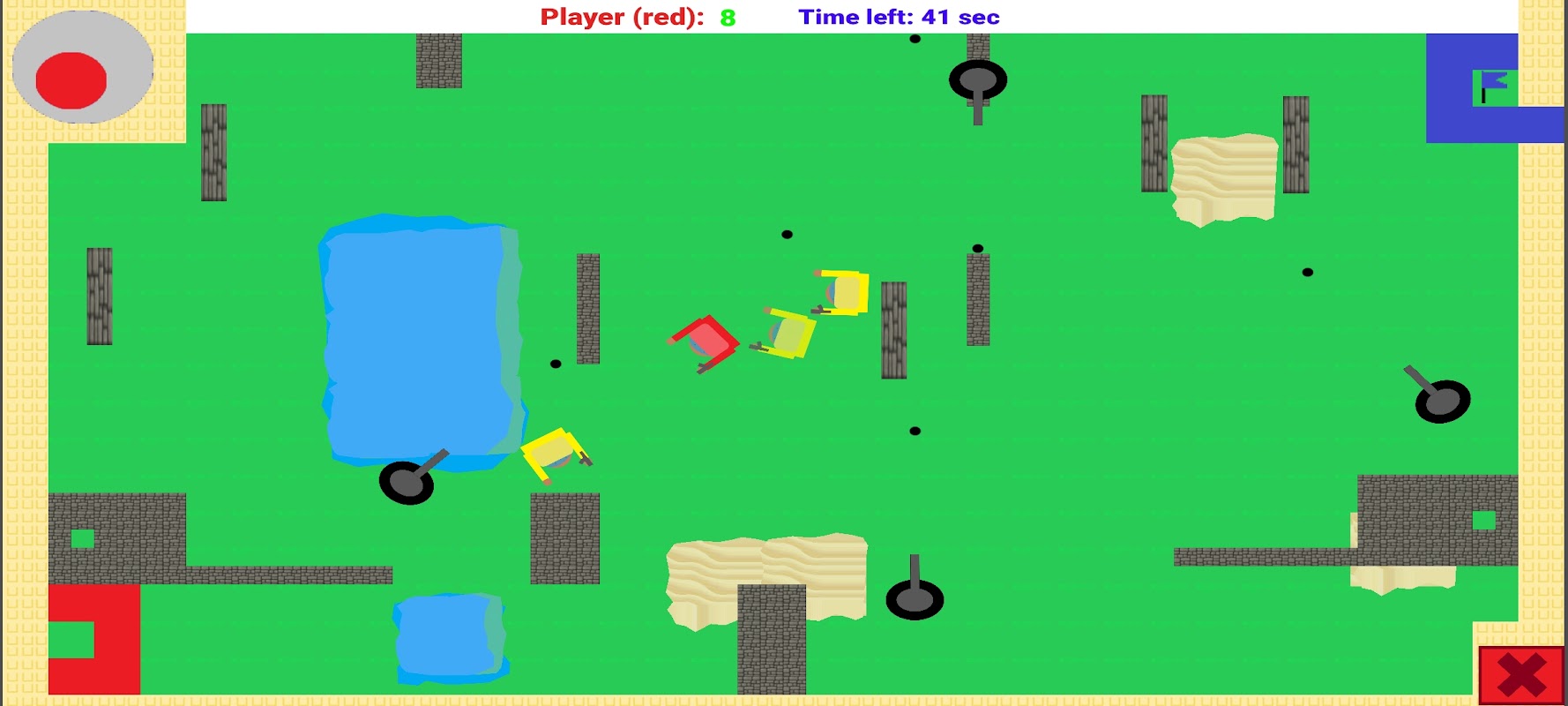 Ada rintangan dan banyak lagi. Tujuan Anda adalah mendapatkan bendera teman Anda dan kembali, tetapi hati-hati! Teman Anda akan mencoba mencegahnya dengan menembak Anda. Jadi, Anda harus mendapatkan bendera lainnya dan melindungi bendera Anda sendiri pada saat yang sama! Siapa yang akan menang?