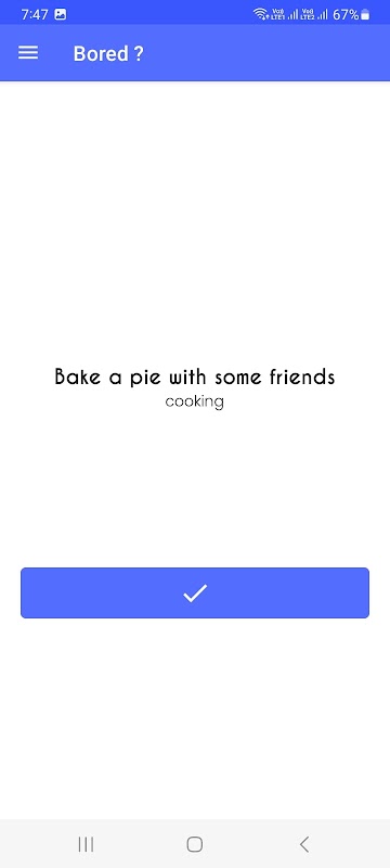 Aplikasi ini akan menghasilkan ide atau aktivitas acak yang dapat Anda lakukan di rumah, kantor, atau di mana pun, dengan teman atau keluarga atau sendirian.