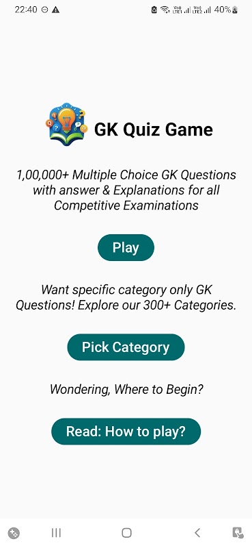 Tingkatkan Bank Soal GK Anda, coba aplikasi soal GK UPSC offline, jelajahi Soal GK Lucent, dan asah pengetahuan Anda dalam permainan kuis pengetahuan umum. Aplikasi ini adalah Permainan Kuis Soal GK terbaik bagi pelajar yang ingin berlatih Soal GK semua mata pelajaran, Soal GK sederhana, dan meningkatkan skor ujian kompetitif mereka secara efektif.
