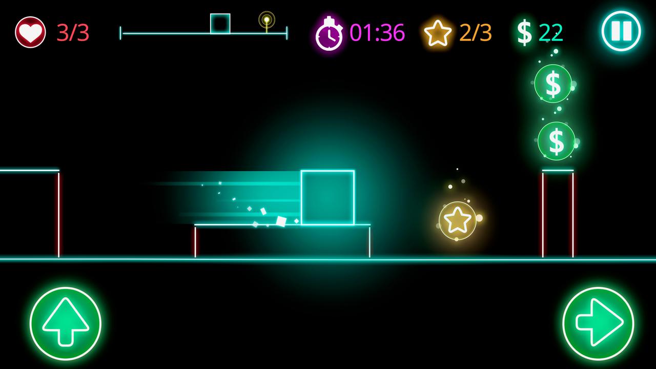 Buat lompatan neon persegi anda melalui halangan geometri dalam permainan platformer ini.