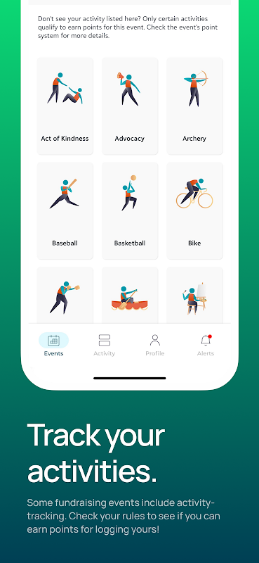 • Catat aktivitas dan dapatkan poin ke papan peringkat acara Anda dengan menghubungkan pelacak favorit Anda: Apple Health, Fitbit, Garmin, Strava, MapMyRun, memeriksa gym, atau melacak secara manual dari 60+ ubin khusus (*aktivitas yang tersedia ditentukan oleh koordinator acara Anda)