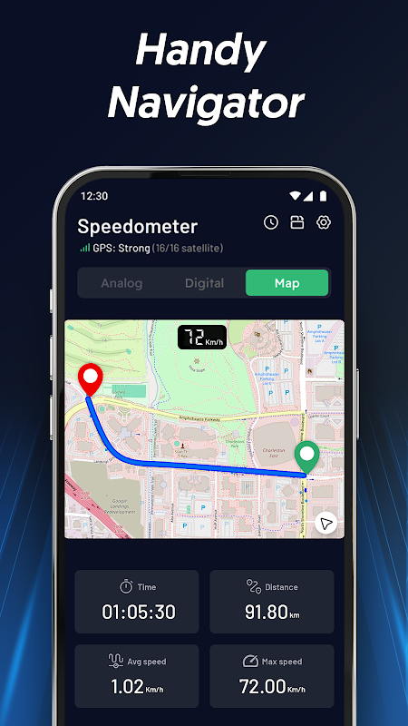 Fitur navigasi GPS menyediakan pelacakan lokasi real-time dan pemetaan perjalanan intuitif. Dengan mode HUD yang mudah digunakan, pelacak kecepatan yang kuat ini akan menunjukkan kecepatan Anda dalam angka seperti speedometer mobil sungguhan. Lacak kecepatan dan lokasi Anda secara akurat, bahkan saat offline. Beralih dengan mulus antara satuan kecepatan dalam kilometer per jam (km/jam), mil per jam (mph), dan knot