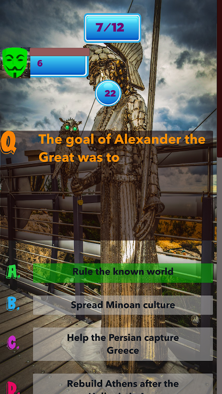 Permainan pengetahuan Yunani ini membantu pengguna untuk mengasah pengetahuan dan indra mereka, membantu mereka mempersiapkan ujian atau tes yang didasarkan pada semua Aspek Yunani dan membantu mereka meningkatkan pengetahuan mereka. Aplikasi ini menargetkan orang-orang dari segala usia, bahkan anak-anak dapat menikmati tes yang dibuat oleh aplikasi ini dan dapat meningkatkan Pengetahuan Yunani mereka. Aplikasi ini dapat digunakan untuk persiapan kuis Sekolah, Kolase, dan Universitas dan juga untuk tes masuk. Aplikasi ini berisi fitur keren seperti mewarnai tombol hijau jika jawabannya benar atau mewarnai tombol merah karena jawabannya salah. Ini menyediakan fungsionalitas multi-pemain yang memungkinkan Anda bermain melawan pemain di seluruh dunia. Ini berisi grafik yang bagus dan lebih sedikit Iklan. Aplikasi ini sangat efisien, dikembangkan sedemikian rupa sehingga dapat berjalan dengan lancar di perangkat apa pun..