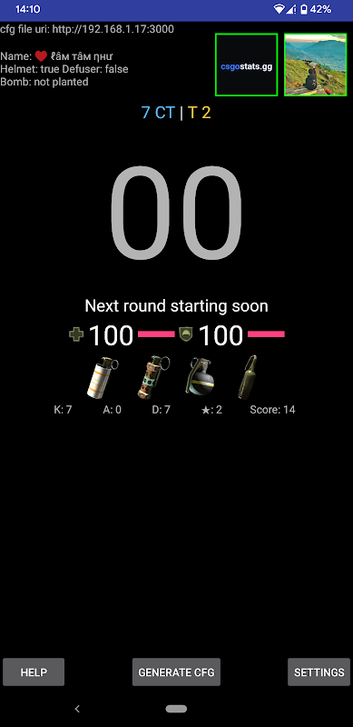 Aplikasi ini menggunakan Integrasi Status Game Counter-Strike untuk memulai hitungan mundur secara otomatis ketika bom ditanam di game CS2 atau CS:GO Anda saat ini. Jika layar Anda mati saat bom ditanam maka akan menyala hingga putaran berakhir. Ini juga menunjukkan beberapa statistik permainan tambahan tentang pemain yang sedang dilihat seperti apakah mereka memegang kit defuse, pembunuhan dan kematian mereka, dan apakah mereka memiliki VAC atau larangan permainan di akun mereka. Mengetuk avatar pemain akan membawa Anda ke halaman profil Steam mereka. Ada juga link ke halaman csstats untuk pemain.