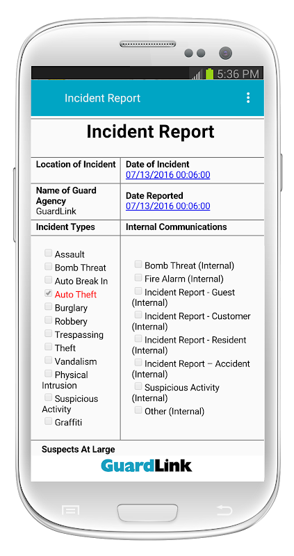 Incident reporting is a vital part of the job, and all security professionals frequently have to complete and submit reports to their superiors and their clients. To facilitate this, the GuardLink system utilizes Dropdown Menus and Voice Dictation to make incident reporting easy. The system gives its users the ability to generate a detailed and properly formatted report. The report includes a description of the incident, details regarding the subjects involved, and any related photos or videos.