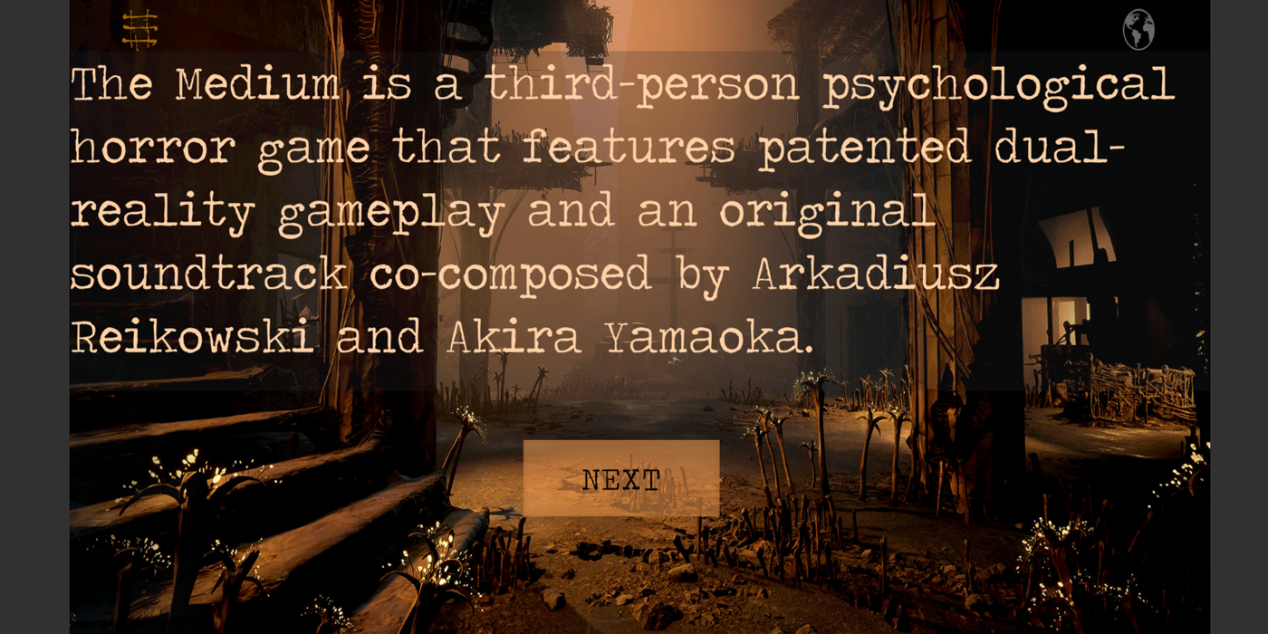 Medium adalah gim horor psikologis orang ketiga yang menampilkan aspek gim realitas ganda yang dipatenkan dan trek suara asli