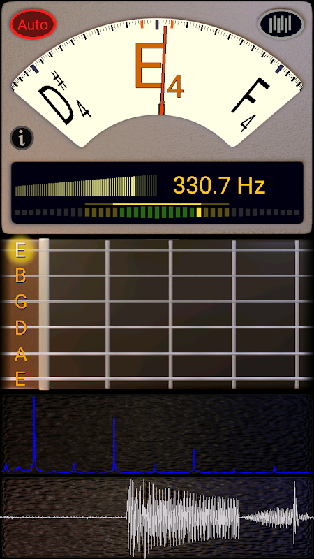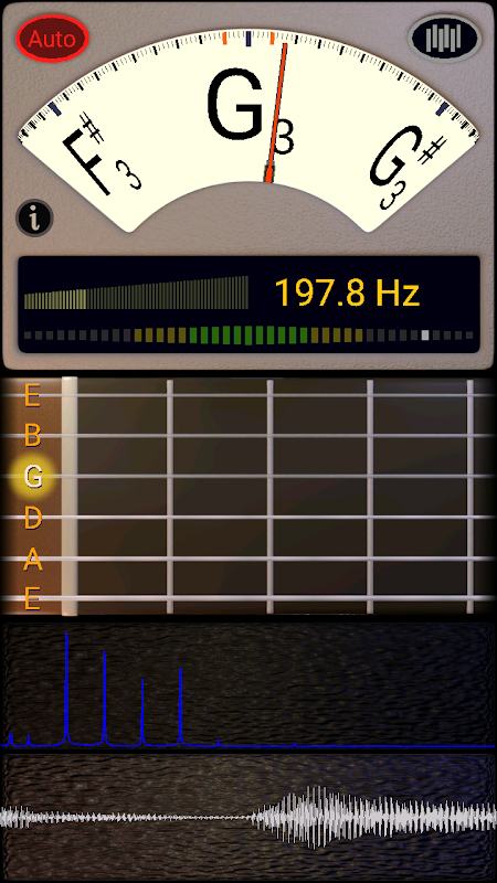 Aplikasi ini menggunakan mikrofon Anda untuk mendeteksi string yang dimainkan dan menunjukkan jika Anda harus tune up atau bawah.