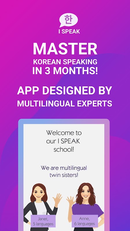 "I Speak" adalah terobosan kursus bahasa Korea Intensif Berbicara yang telah dikembangkan untuk memastikan pengguna akan mengembangkan keterampilan percakapan bahasa Korea yang kuat dalam waktu singkat - 2-4 bulan! Pelatih percakapan terintegrasi "I Speak" akan meningkatkan keterampilan berbicara bahasa Korea Anda ke tingkat berikutnya tanpa Anda sadari. Karya terbaik untuk pembelajar tingkat TOPIK 1-2.