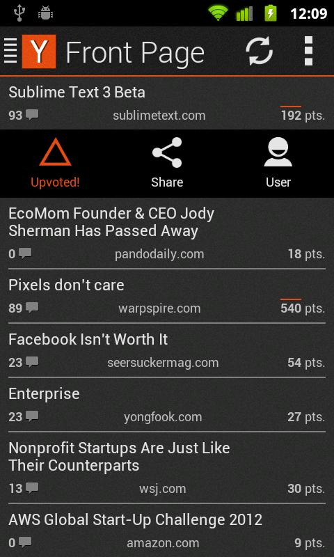 A Hacker News (news.ycombinator.com) client for Android phones with a focus on the user interface. You can login, upvote, and reply to stories and comments. It scrapes the data directly from the site, so it should be a little more reliable than something that uses a third party API.