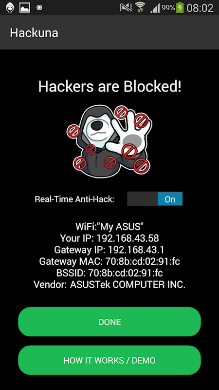 Good news for you! By turning on the "WiFi Hack Blocker" in Hackuna, you can now detect if someone is hacking you and at the same time YOU CAN TRACK THE HACKER! Yes! You've read it right! So if you are in a coffee shop, you can now confront the hacker hacking you because Hackuna will tell you what device or model laptop they are using!