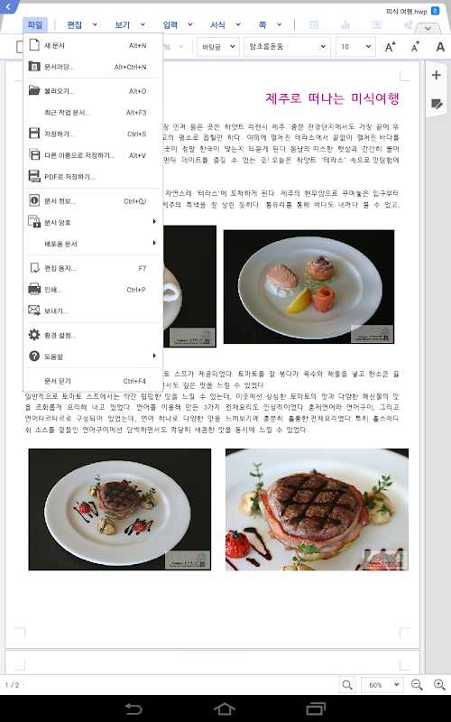 - 새 문서 만들기, 문서마당, 불러오기, 최근 작업문서 불러오기
