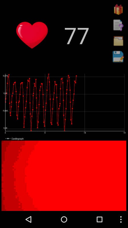 Memantau denyut jantung menggunakan algoritma pengolahan citra canggih untuk mengukur aliran darah di ujung jari Anda. Pola jantung berdetak divisualisasikan oleh "Rings Darah" kontrak itu dan memperluas per detak jantung ditampilkan pada pratinjau kamera. Karakteristik detak jantung, periode dan keteraturan diplot sebagai Cardiograph, serta HBPM (Detak Jantung Per Minute), semua berada di real time.