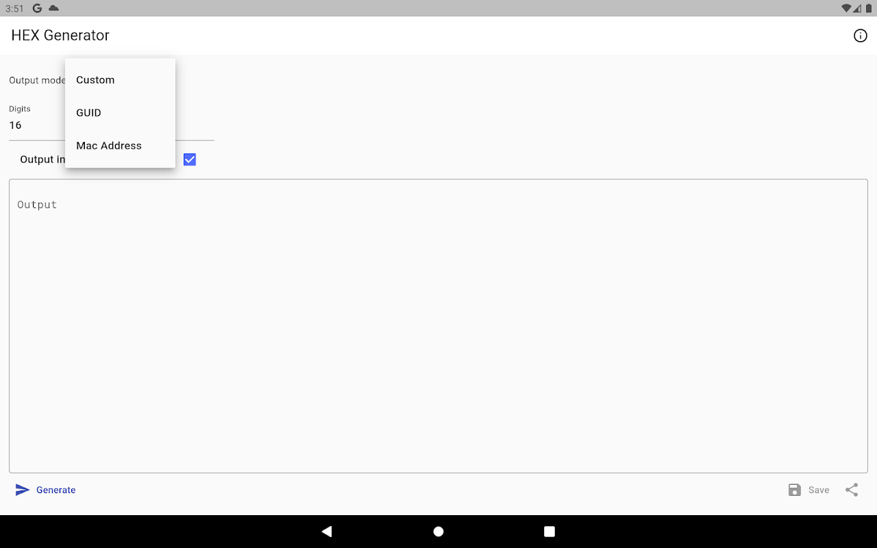 Generator string hex sederhana dengan kemampuan untuk menghasilkan 3 jenis berbeda, termasuk alamat MAC dan GUID. Output dapat dihasilkan dalam huruf kecil dan besar