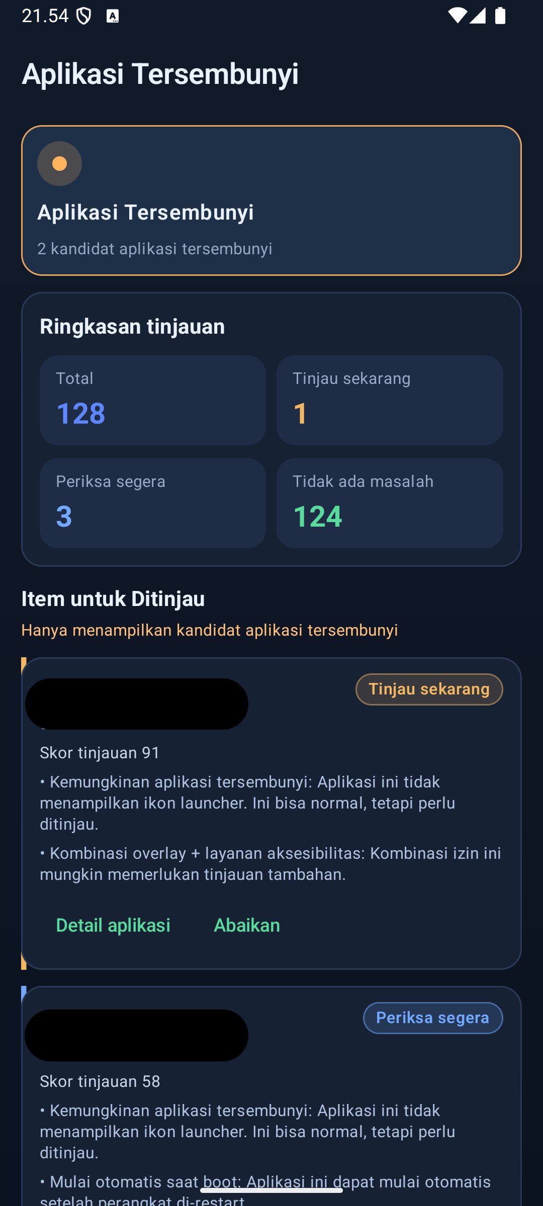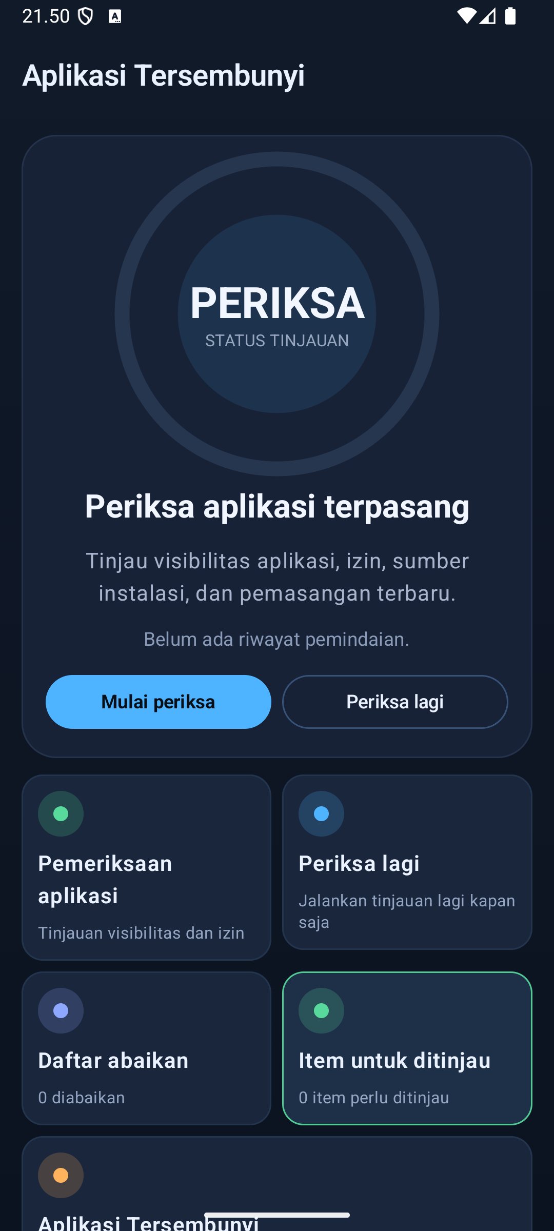 Aplikasi Tersembunyi meninjau aplikasi yang terpasang agar Anda dapat memeriksa kandidat aplikasi tersembunyi, izin, sumber instalasi, dan aplikasi yang baru dipasang dalam satu tempat.