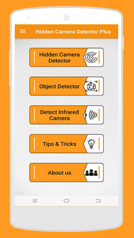 Aplikasi Detektor Kamera Tersembunyi adalah cara terbaik untuk mendeteksi kamera tersembunyi dan perangkat mata-mata lainnya, memberikan tingkat keamanan dan privasi yang dapat Anda percayai. Aplikasi kami menggunakan teknologi mutakhir untuk memindai semua kamera tersembunyi dan perangkat perekam lain di sekitar Anda. Apakah Anda berada di kamar hotel, ruang ganti, atau ruang pribadi lainnya, aplikasi kami membantu Anda tetap terlindungi dari pengintaian.