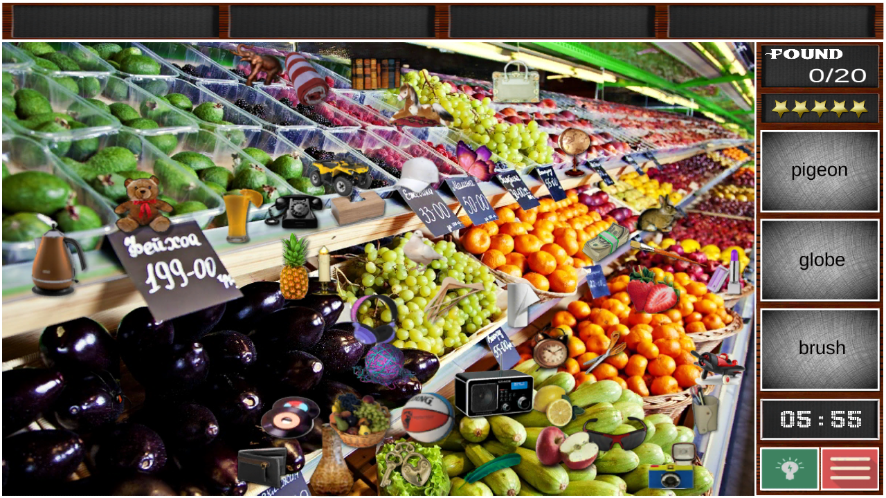 Desain permainan indah memberikan jam menyenangkan saat Anda harus mencari berbagai hal yang tersembunyi seperti harta, permen, buah-buahan dan sayuran, mainan, mutiara, cangkir kopi, hewan kecil yang lucu seperti anjing dan kucing, burung beo dan boneka beruang dll