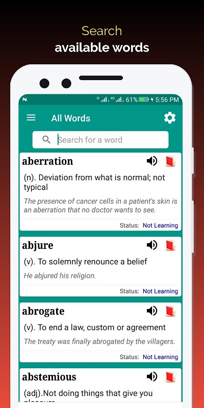 Aplikasi ini, ditargetkan untuk siswa Sekolah Menengah, berisi kata-kata yang dipilih dengan cermat yang diperlukan untuk bahasa Inggris tingkat sekolah menengah. Aplikasi ini juga berisi daftar kosakata yang harus dipahami oleh siswa untuk mendapat nilai tinggi dalam ujian SAT baru. Setiap kata dalam aplikasi berisi makna dan kalimat untuk menunjukkan penggunaannya. Selain itu, fobia dan mania disertakan untuk pelajar yang antusias.