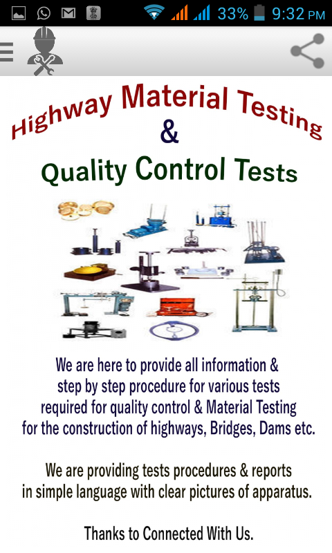 Berikut adalah aplikasi Android untuk mengetahui tentang berbagai tes & inspeksi Kualitas dalam Konstruksi Of Jalan & Jembatan. Kami Menyediakan langkah-langkah prosedur dari setiap tes dengan gambar yang diperlukan. Kami mencakup semua tes untuk tanah, agregat, semen, beton segar, beton mengeras, aspal.